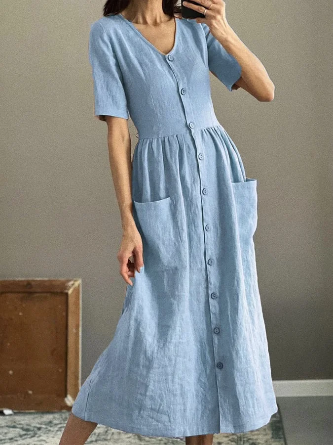 LM | Women's plain-colored casual dress with V-neck and pockets